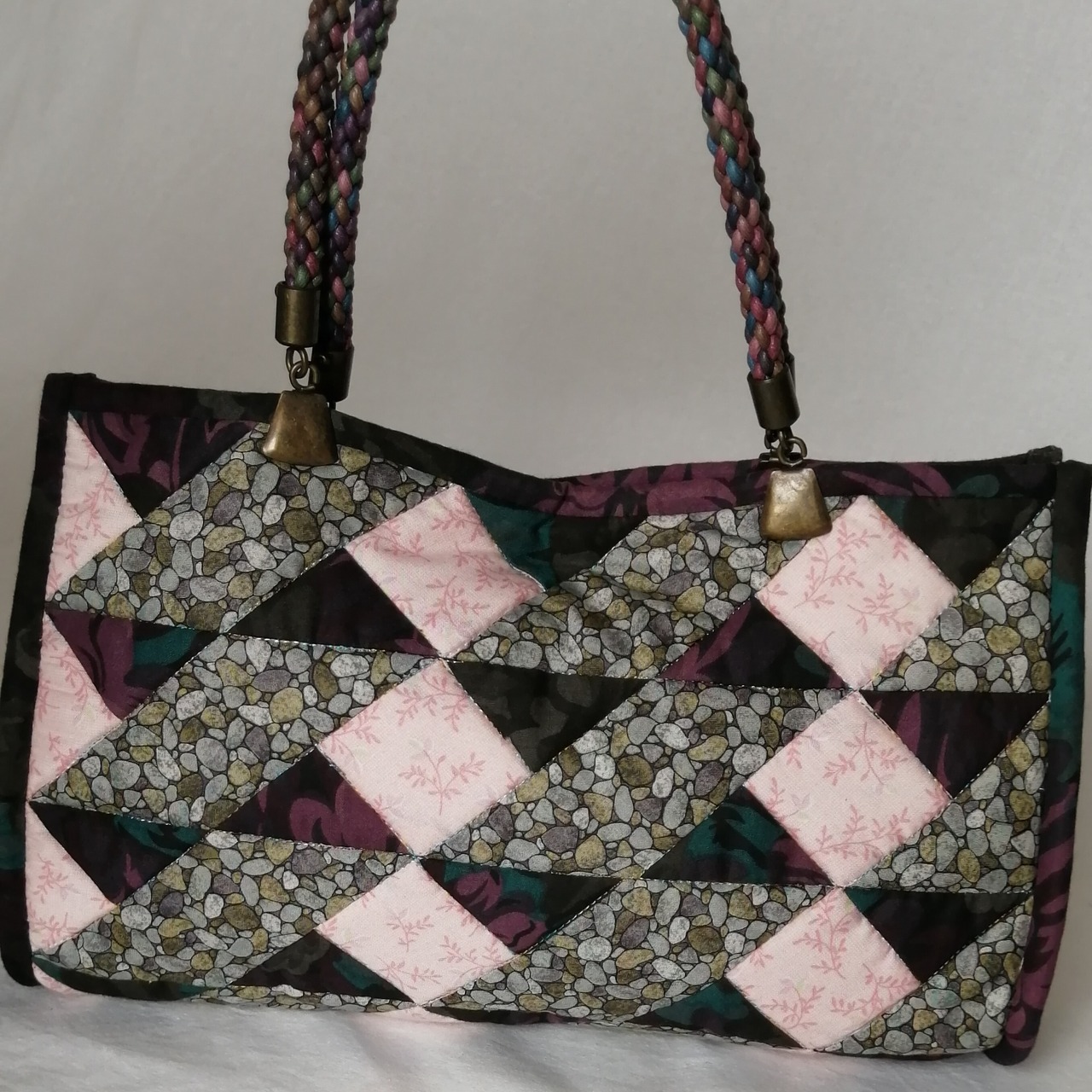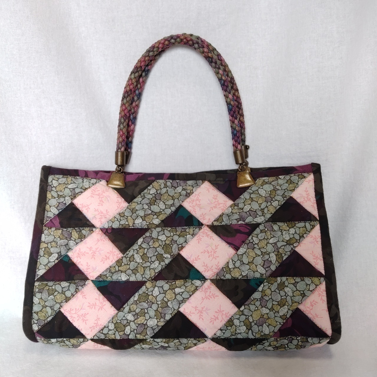 三角と四角の布を縫い合わせたパターンのパッチワークでバッグを作りました