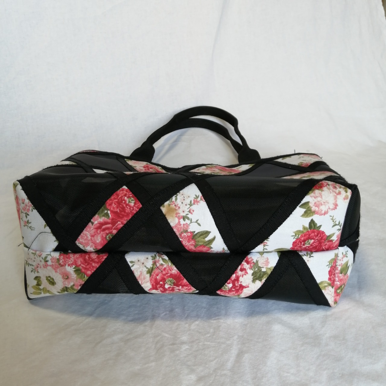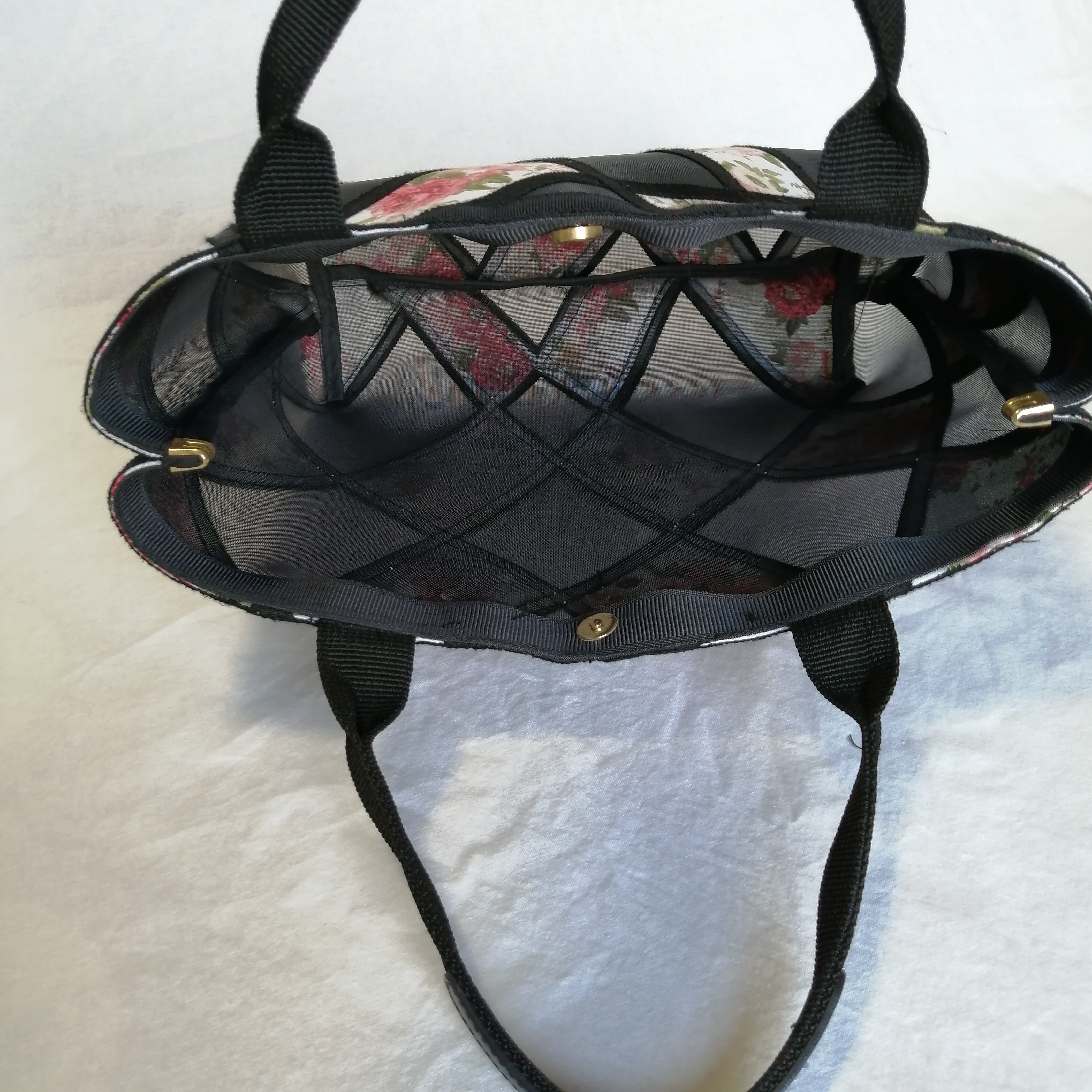 黒のメッシュに生地を乗せて、グログランテープを使ってミシンしました。